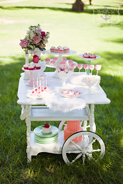 Photography: Sienna Rose Photography http://www.siennarosephotography.com/Cake stands, dessert plates, child teacups, teapots, vintage glassware, vintage milk glass vases, antique tea cart, styling, and florals: Minted and Vintage http://www.mintedandvintage.com/